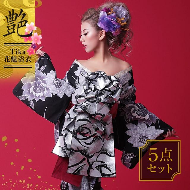 浴衣 花魁 ゆかた 花魁浴衣 セクシー 花魁セット 黒 紫 金 銀 夏祭り セット お化けの日 Tika ティカ 疋田花柄 おいらん浴衣 5点セット 下駄 平帯 兵児帯 肌襦袢 Tk Yko19 8fsi2 Tika ヤフーショッピング店 通販 Yahoo ショッピング